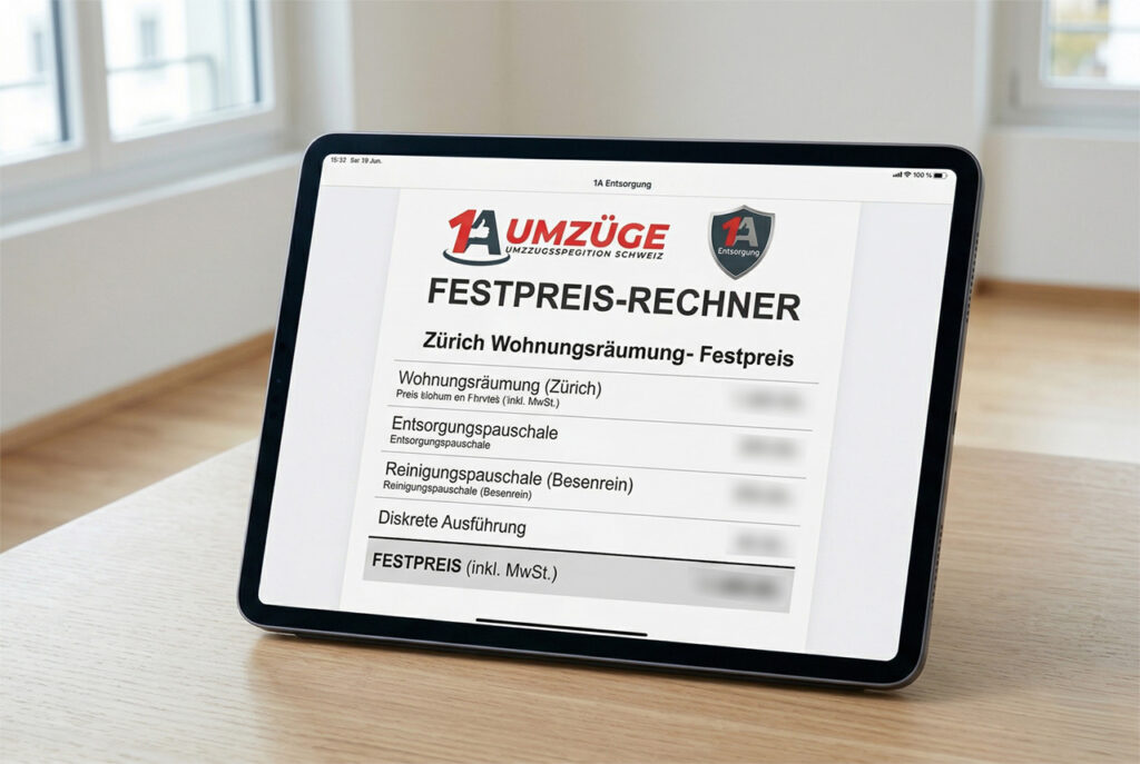 Unsere Preise sind fest und transparent: ab CHF 800 für 1-Zimmer, abhängig von Volumen/Möbeln. Kostenlose Besichtigung!